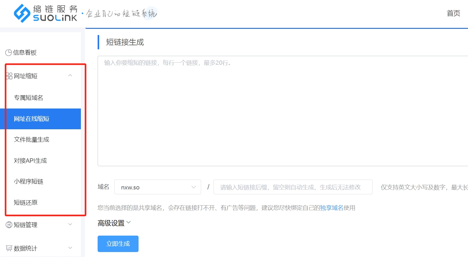 缩链(suolink.cn),企业级营销推广SaaS平台,支持单个/多个/批量生成短链接,支持企业系统API对接生成短链接,支持绑定企业品牌域名生成短链,支持一人一链推广,支持自定义短链接后缀,可自由设置短链接有效期,支持设置访问密码、假量过滤、智能跳转、限制访问等特色功能。