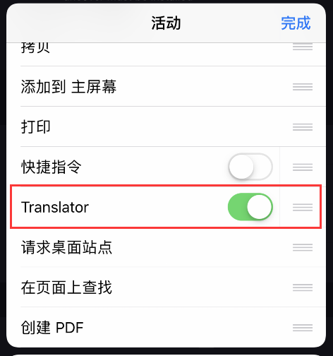 下载完成后,我们只要打开Safari浏览器,在要翻译的界面,点击浏览器下方的箭头,滑到点后面的「...」,将「Translator」打开,开启软件翻译权限。