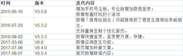 为了深入分析丁香医生的版本迭代节奏,探究产品迭代逻辑,笔者对丁香医生从V2.7上线到V8.3.5的所有核心版本迭代整理如下: