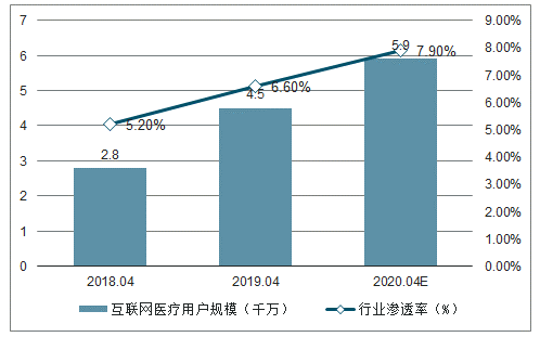 目前互联网医疗产业链逐步成形,在线挂号及问诊企业已从流量争夺进入到了医疗资源扩张的比拼阶段。2018年中国互联网医疗行业市场规模达到491亿元,同比增长51.08%;2020年有望达到900亿元,2018-2020年的CAGR为35.39%,保持快速增长态势。2019年4月我国互联网医疗用户规模为4.5千万,行业渗透率为6.6%,到2020年4月,用户规模有望上升至5.9千万,渗透率达到7.9%。
